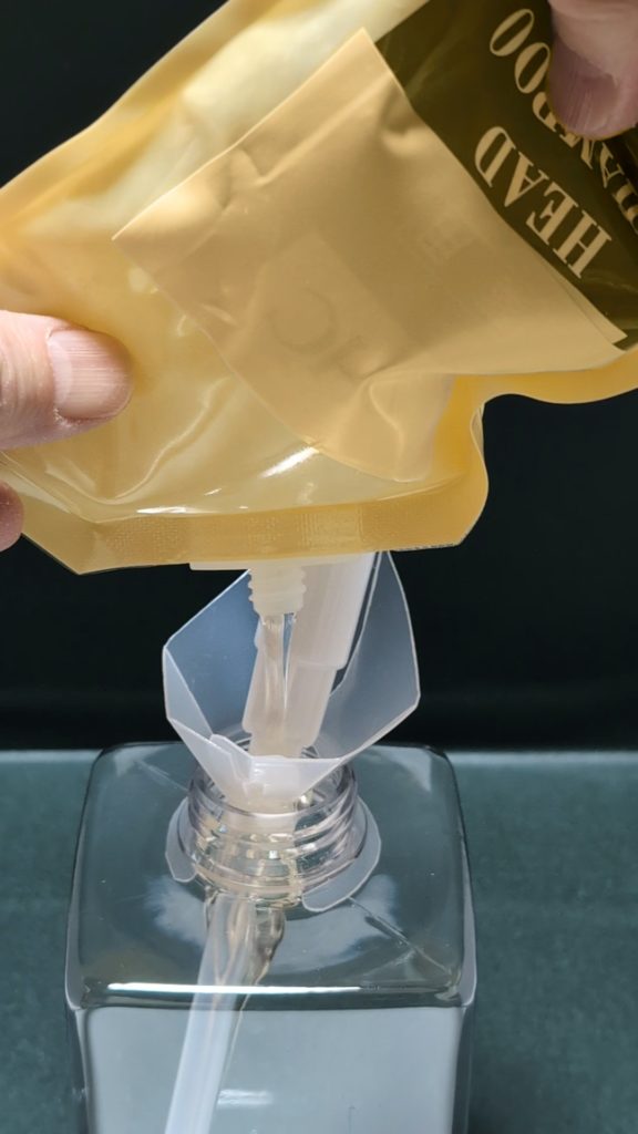 「つめかえジョーズ シャンプー用」を使用してシャンプーを詰め替えた動画です。